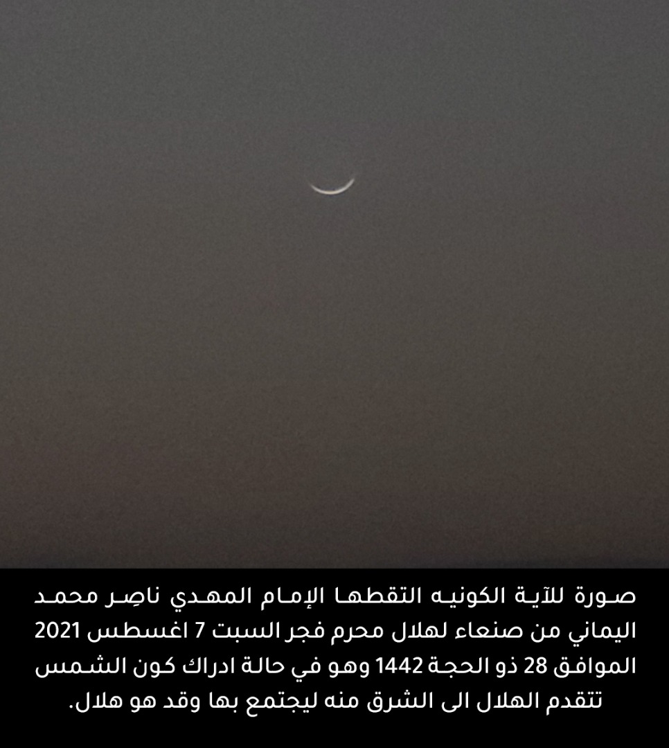 وموعدنا مساء يوم الجمعة ليلة السّبت؛ ليلة يستدير القَمَر البَدْر لشهر مُحرَّم الهجريّ 1443 حسبَ تأريخكم الهجريّ إن كان حقًّا صَدَق خليفةُ الله الإمام المهديّ ناصر محمد أن يُعلِن للبشر بأمرِ الله الواحد القهّار أنّ الشّمس أدركتِ القمر فَوُلِد الهلالُ من قبل الكسوف واجتمعت به الشّمس وقد هو هلالًا، ولسوف نعلم ليلة استدارة البَدْر لشهر مُحرَّم لعامكم الهجريّ 1443 أصَدَقَ الإمام المهديّ ناصر محمد أم كان من الكاذبين؟ وأنّ لعنة الله على الكاذبين الذين يصدّون عن دعوة الحقّ من ربّهم.