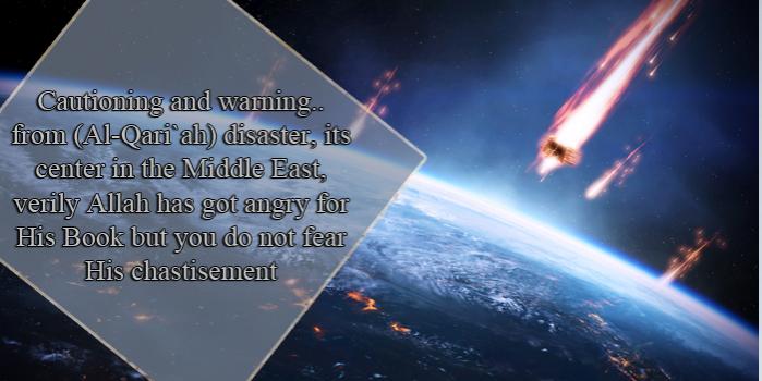 ..Cautioning and warning from (Al-Qari`ah) disaster, its center in the Middle East, verily Allah has got angry for His Book but you do not fear His chastisement